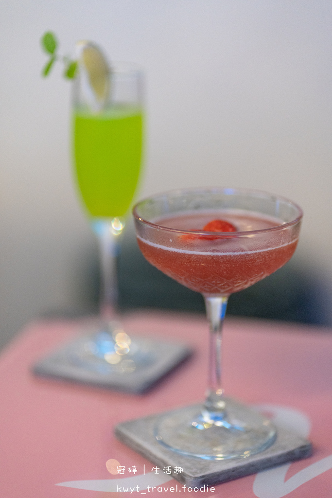 充滿粉紅色泡泡的一杯酒,以萊姆酒為基酒,並加入有果粒感的草莓醬,最後擺上可拼成心型的草莓乾,草莓控可以喝一杯,酒感不重適合作為餐前酒飲用。
