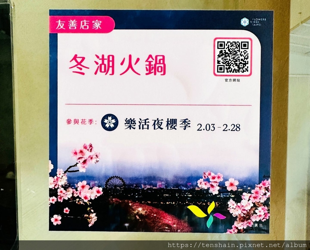 即將飽餐一頓美食,我也很開心!進門前,發現門口貼著 2023【樂活夜櫻季】"友善店家"的認證標誌,想知道店家有什麼相應的優惠活動,請隨時關注「冬湖火鍋」的臉書粉絲團。