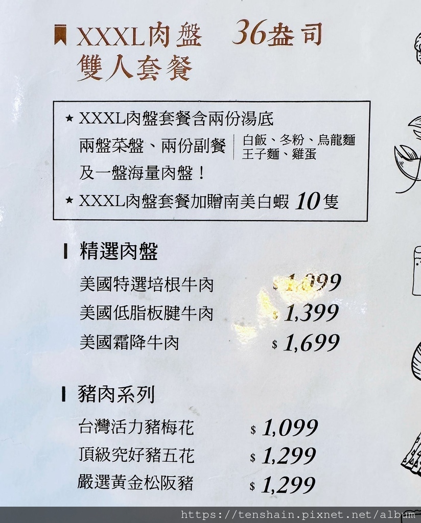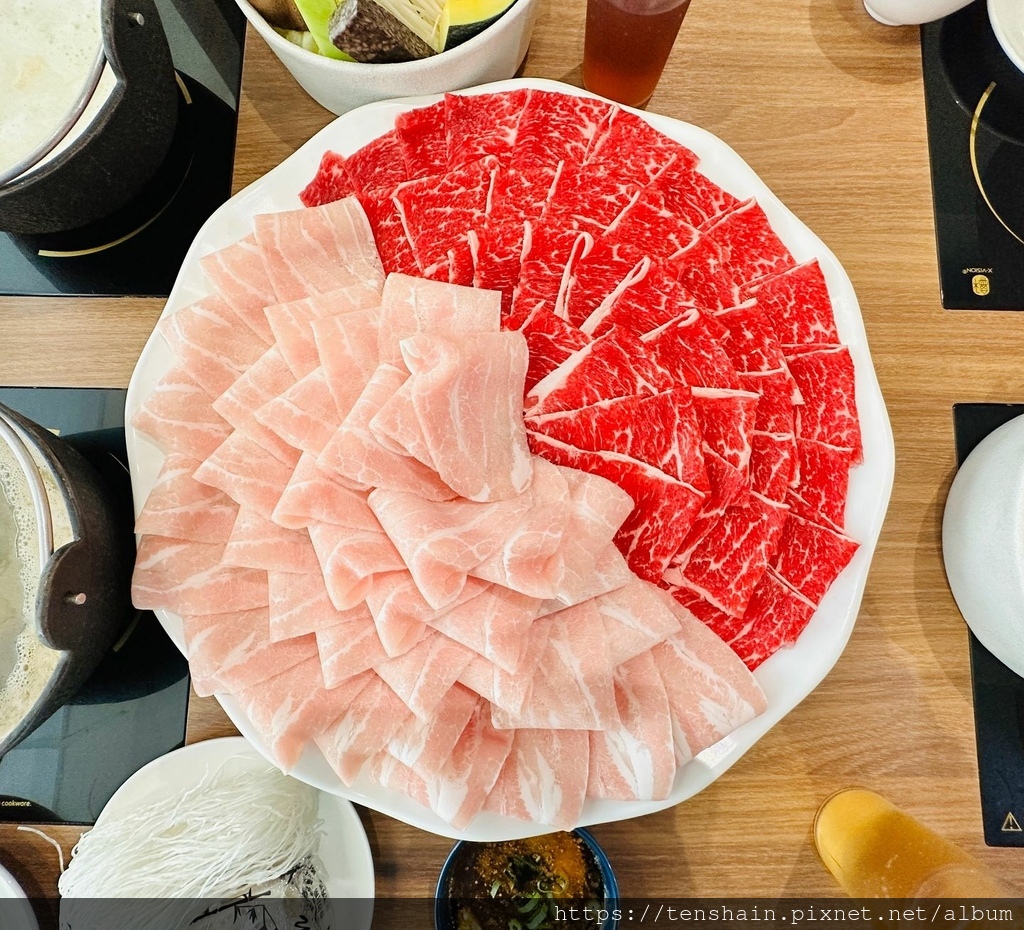 準備點菜了!還記得上次我們吃的是「美國低脂板腱牛肉」,這次我想升級「美國霜降牛肉」,可是,老婆想吃「嚴選黃金松阪豬」...正當我們徬徨在"魚與熊掌"之間,難以取捨的時候,帥哥說話了:「其實我們現在有推雙併的方案...」這下魚與熊掌都可兼得,兩全其美,老闆真的太貼心了!