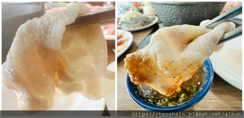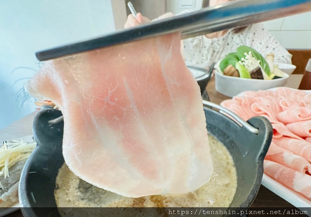雖然油花豐富,但是煮熟的黃金松阪豬毫無油膩感,脆嫩的口感我超愛,咀嚼的鮮甜滋味迷人至極!絲毫腥臊味也無的特質,讓我這個以往視吃豬肉為畏途的人也趨之若鶩,如果你也是跟我一樣,原本不敢吃豬肉的人,建議你勇敢吃一次。對於「冬湖火鍋」的「嚴選黃金松阪豬」,我的評語就是「薄、脆、彈、鮮」,幾乎就是豬肉的天花板,保證讓你一試成主顧。