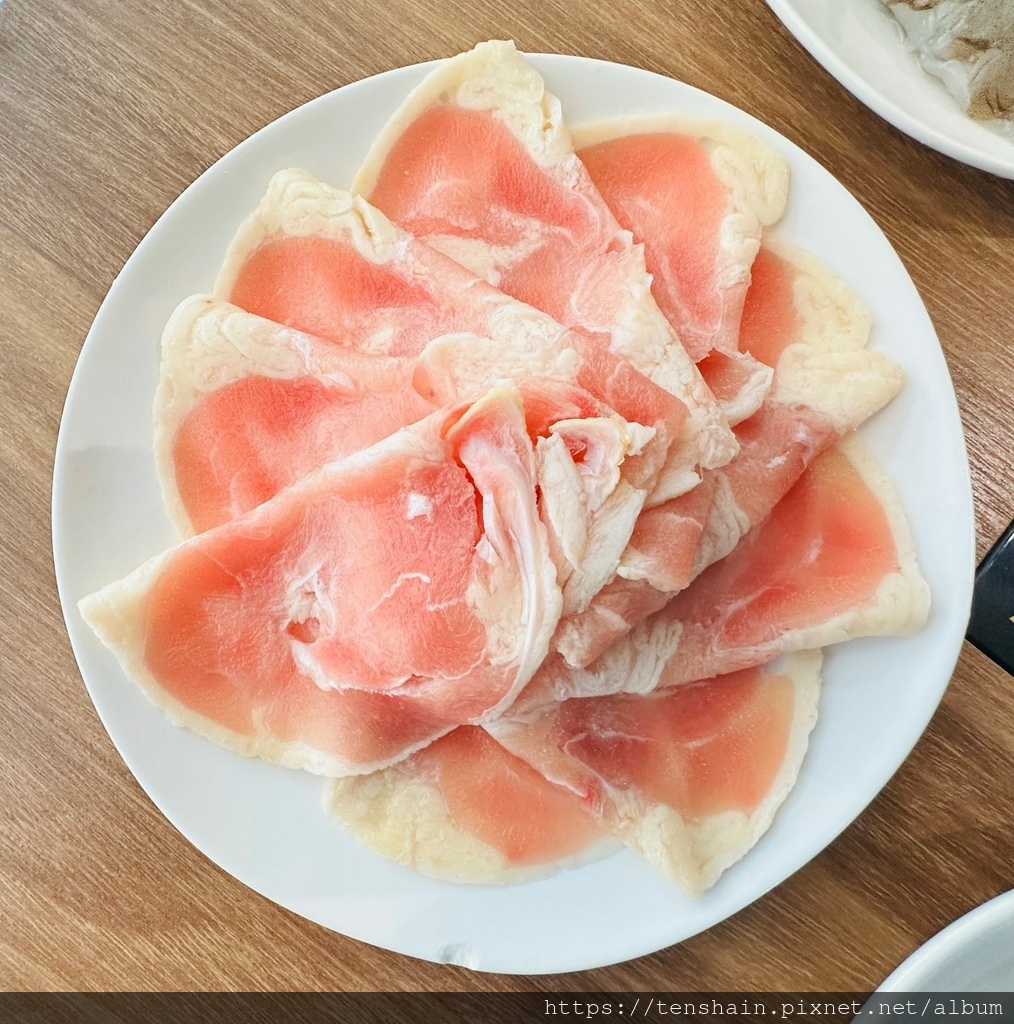 「冬湖火鍋」送菜很大方,點「頂級海陸拼盤」就送培根牛或梅花豬,二選一,老婆大人選了梅花豬,我沒有異議。梅花豬的肉色是漂亮的粉紅,沒有太多的油脂,份量上很有誠意。