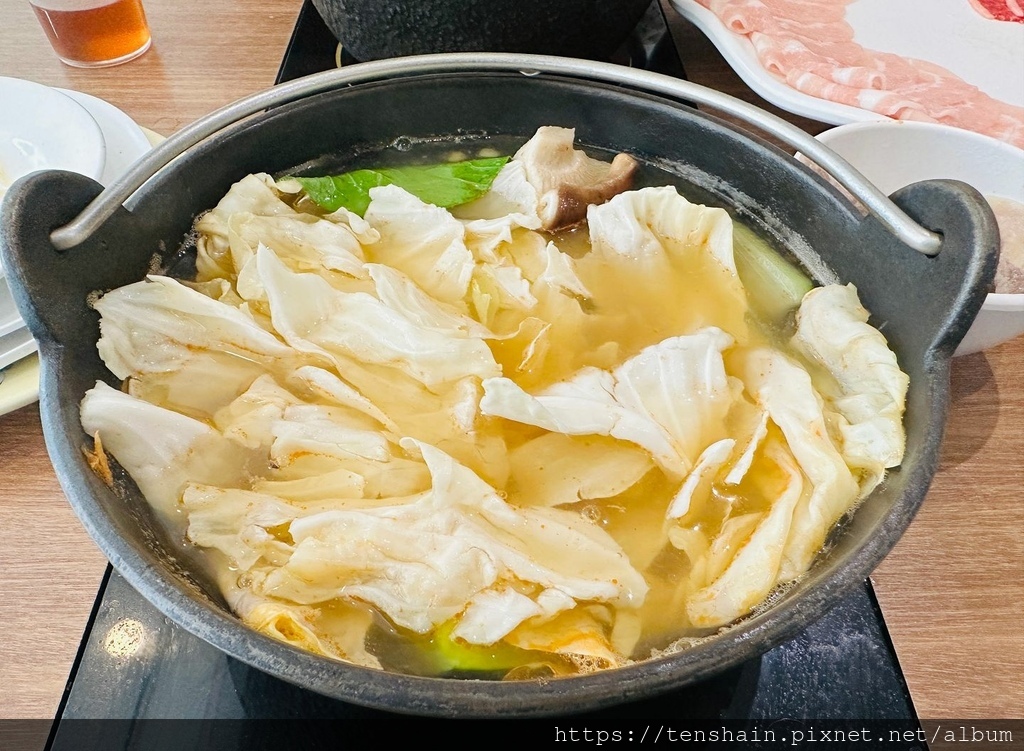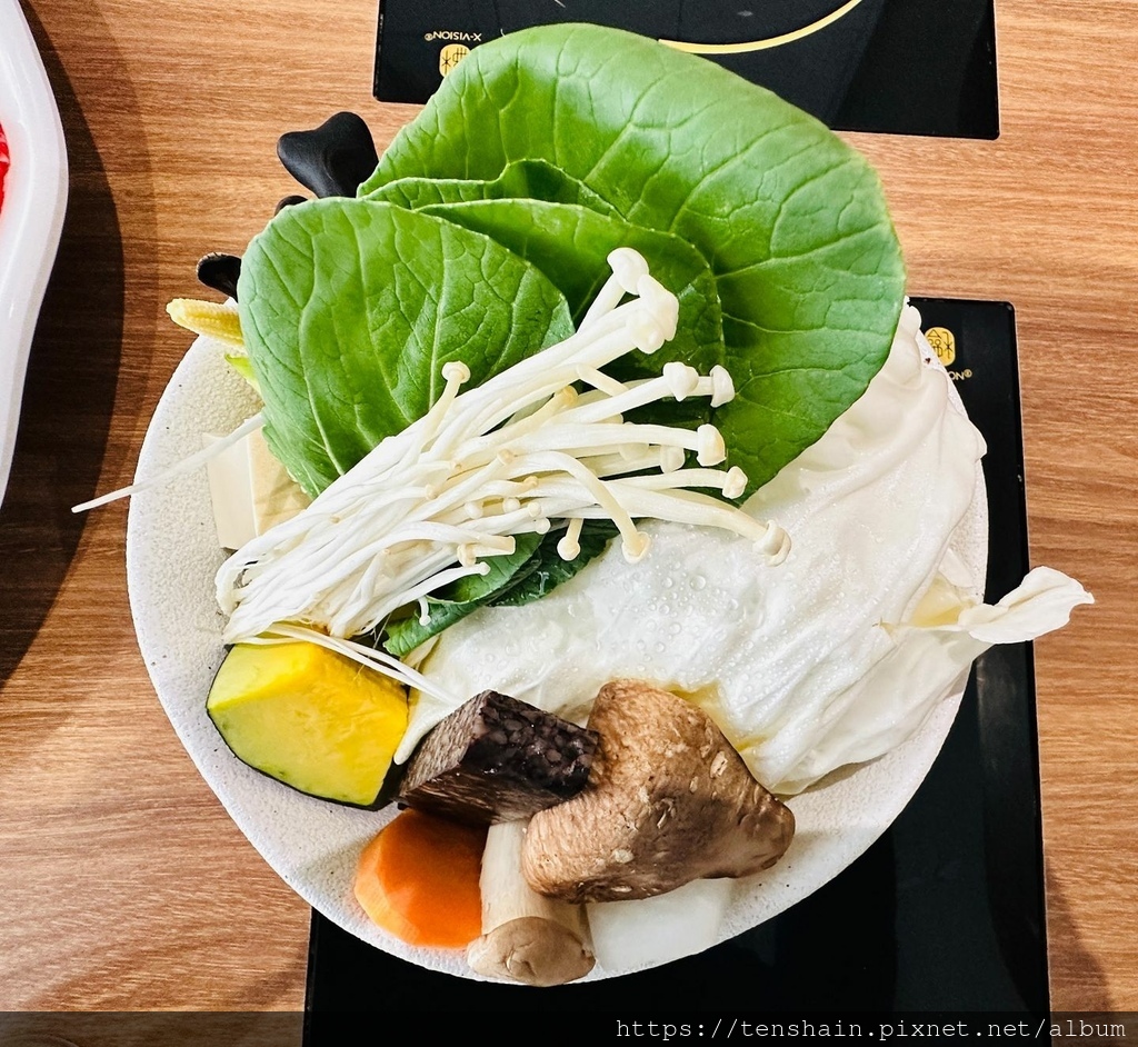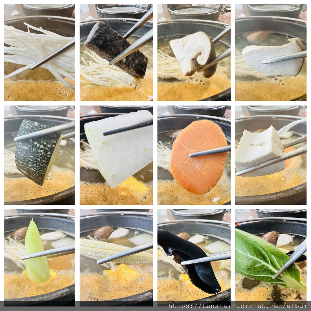 把菜盤一股腦丟進去,剛好滿滿一鍋。煮過海鮮的石頭火鍋湯底,讓蔬菜更加鮮甜,不用醺醬就很好吃。
