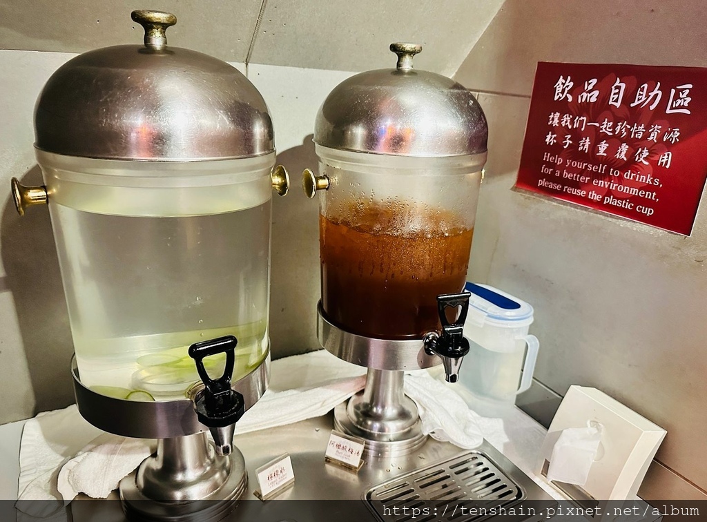 飲料則是在餐廳前方的角落裡,"檸檬水"和"阿嬤酸梅湯"無限暢飲,很有誠意!這次來用餐,感覺進步最多的是飲料,"阿嬤酸梅湯"酸酸甜甜的滋味很濃郁,而且沒有尾韻轉澀的情形,非常難得!免費的飲料有這樣的水準,真的值得讚賞!個人的評價很高,不輸淡水那家很有名的酸梅湯。