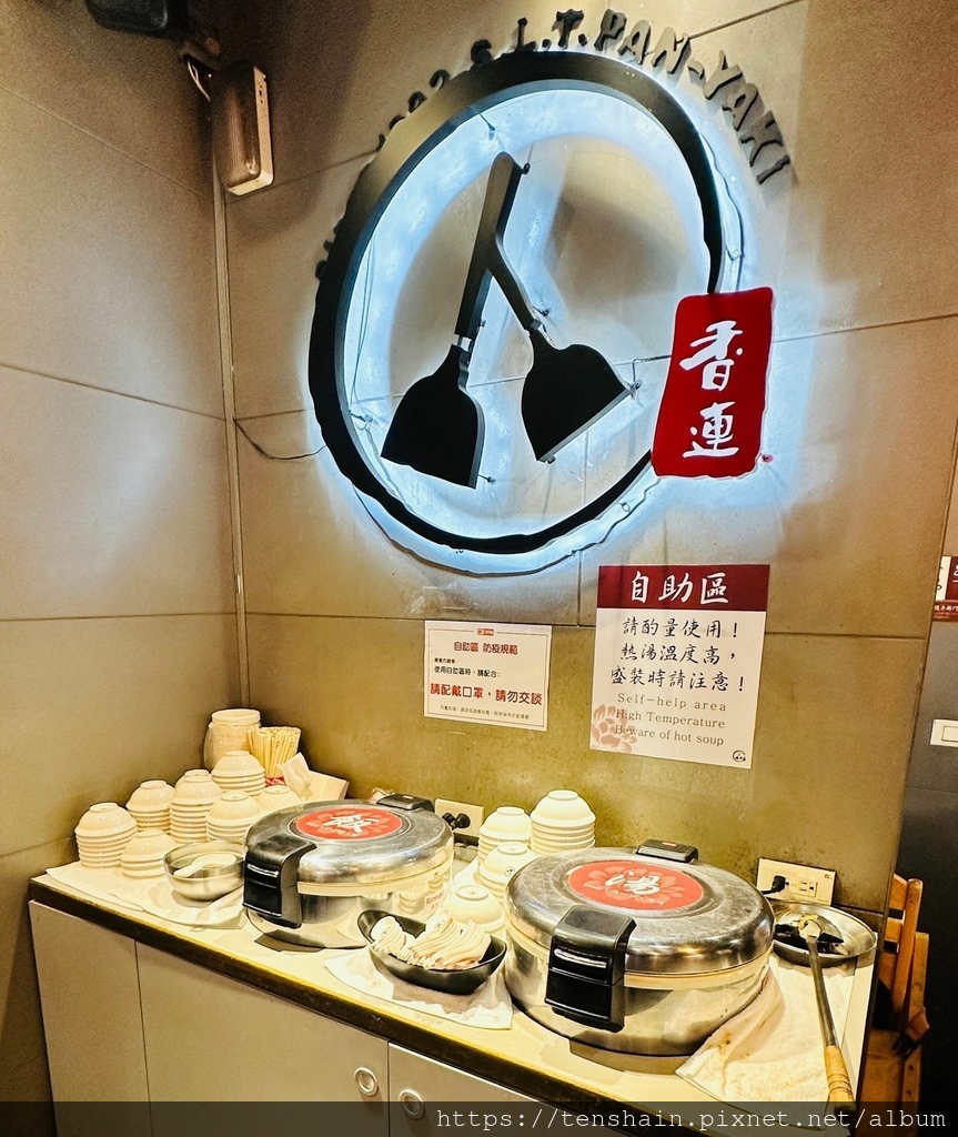 因為不收服務費,所以白飯和熱湯要自己到餐廳後方的自助區取用,無限制吃到飽,不用另外加錢。