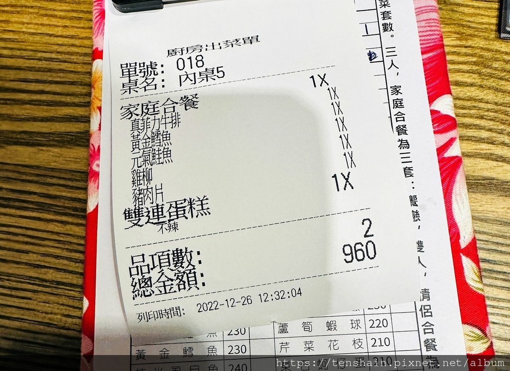 經過一番討論,我們點了一個家庭合餐,主餐是"真菲力牛排、鱈魚、鮭魚、雞柳、豬肉片",附餐有"銀芽、季節時蔬、白飯、熱湯、飲料"。再加點一個女兒指定的"雙連蛋糕",總計 NT 960 元,無須加服務費。