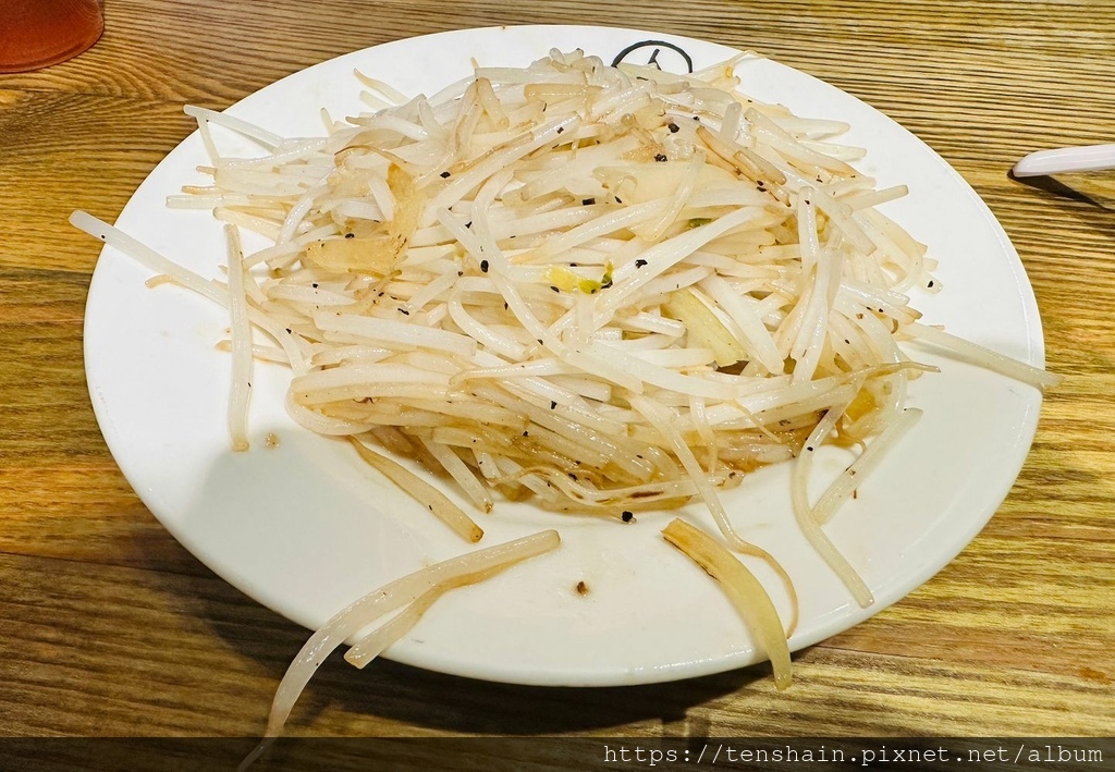 一般平價鐵板燒的豆芽菜都是重口味,「雙連鐵板料理」卻反其道而行,相當清淡,清淡到我們都懷疑是不是師傅忘了放鹽巴?擺盤也很隨興,連基本的修飾都沒有。女服務生端過來的時候,幾根豆芽菜在盤邊晃盪,再加上她放盤子的豪放模式,感覺豆芽菜都快彈出來了。