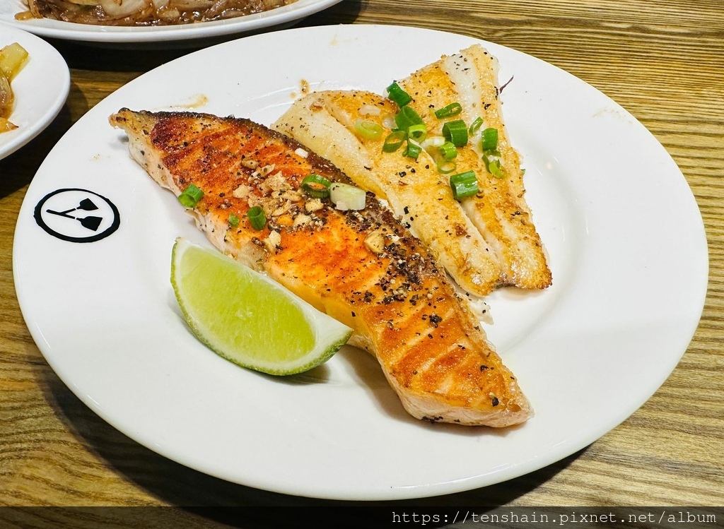 鱈魚、鮭魚兩道菜放在同一個盤子出,這師傅真有環保概念。鱈魚沒有想像中的嫩,鮭魚沒有印象中的油潤,調味也沒有突出之處。