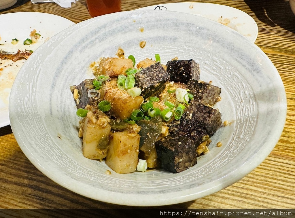 "雙連蛋糕"不是大家望文生義,會出現在腦海中的那種生日蛋糕,而是「蛋+糕」的組合,裡面有皮蛋、鹹鴨蛋、蘿蔔糕、豬血糕。這是「香連鐵板料理」的創意料理,也是小女特別要求必點的菜色,沒想到這次卻讓是最令我們失望的一次,小女吃了一塊立刻放棄,不是口味變差,而是豬血糕竟然有了腥味!