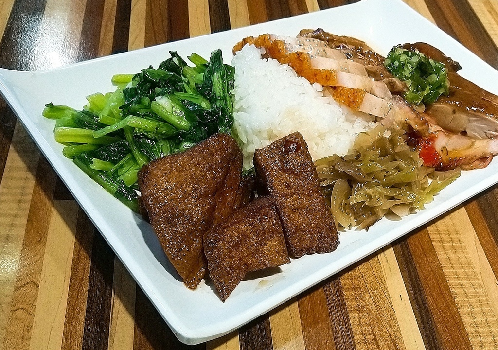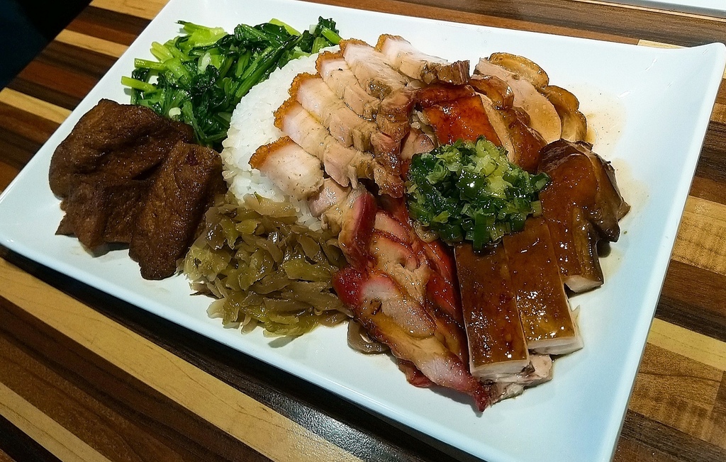 我點三寶飯( 叉燒+油雞+燒鴨)加燒肉,豐富的份量根本就吃不完,淋上極有誠意的油蔥醬,油雞鮮嫩多汁又齒頰留香,鴨肉油脂極為豐富,吃起來軟嫩又Q彈的口感讓人回味無窮,煙燻燒鴨特別令人滿足,大呼過癮,更是華人的情意結,每個人都很愛吃燒臘!
