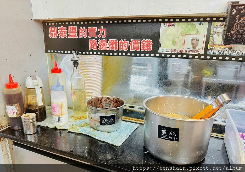 吃湯包,照例要搭配一些佐料。薑絲必不可少,醬油、醋、香油也要來一點,至於辣椒,就給無辣不歡的朋友享用吧!醬料台上「鼎泰豐的實力,路邊攤的價格」的標語,在我看來,既是一種自我肯定,也是一種自我期許。至於是否名副其實?留待親自品嚐過的朋友自行評斷。