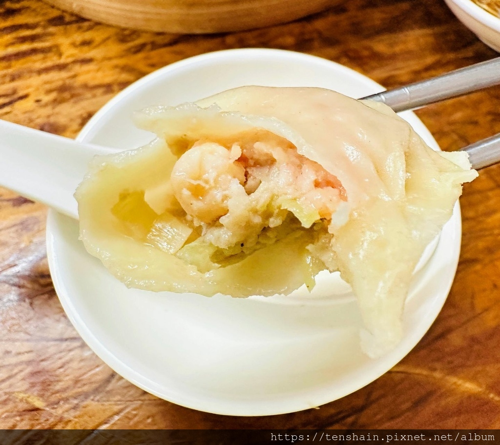 我喜歡吃蝦,所以只要有蝦的料理都喜歡。蝦仁蒸餃的內餡有"蝦仁、韭黃、豬後腿肉",整隻完整的蝦仁吃起來很過癮,新鮮彈牙有蝦味;後腿肉精瘦,這個我喜歡,因為我很怕吃到太多肥肉;韭黃香,麵皮不會太厚,口感 Q 又有勁。