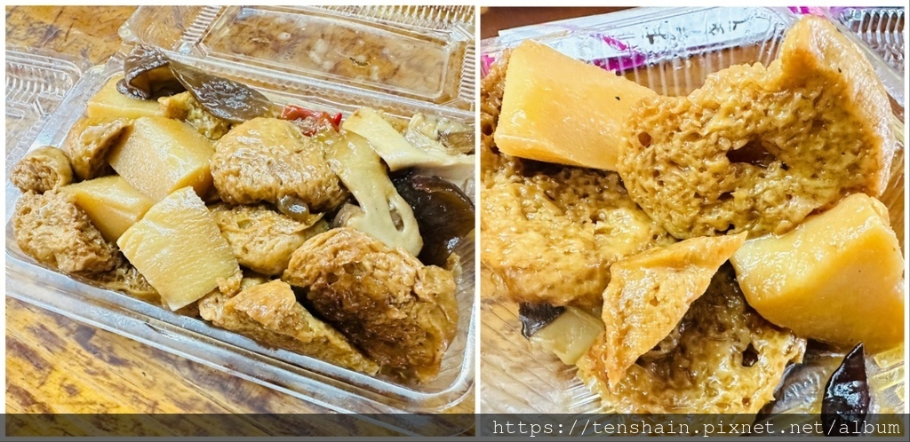 「四喜烤麩」是上海年節非常熱門的涼拌菜,這盒小菜是它的簡化版,只有烤麩、竹筍和黑木耳。烤麩其實就是麵筋,好不好吃的重點在於醬汁。因為烤麩的內部像海綿一樣,充滿大大小小的孔隙,極易吸收醬汁。放冷後,鬆軟的麩體會恢復彈性,所以冷吃比熱食美味。