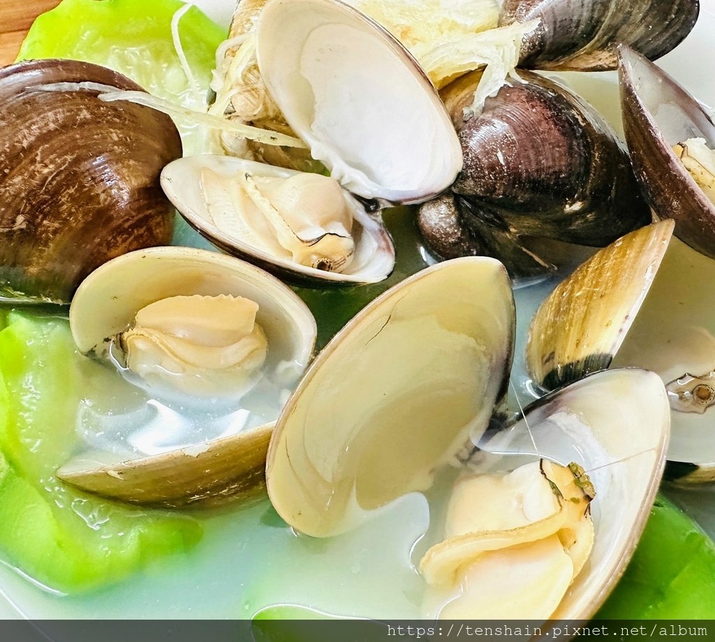 "蛤蜊蒸絲瓜"是一道清爽鮮甜沒油脂的料理,吃起來暑氣全消,正適合炎炎夏日食用。絲瓜鮮甜,纖維綿軟;蛤蜊用薑絲去腥提鮮,蛤肉 Q 彈,飽滿多汁,鮮度十足。乳白色的湯汁,更是這道菜的靈魂,因為蒸煮過程不加一滴水,湯汁全是絲瓜和蛤蜊的精華,三兩下就被我們喝個精光。