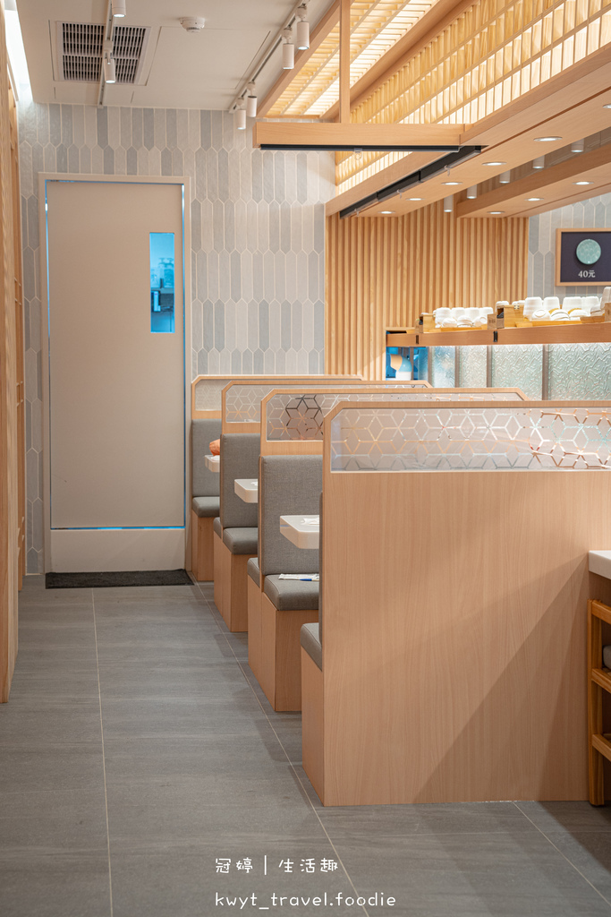 在寬敞、明亮、簡約的日本風格空間裡,環繞著迴轉壽司軌道規劃了6張4人桌與吧檯式長桌區。