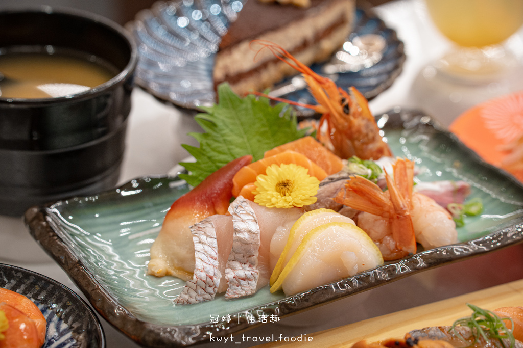 在質感器皿上擺放著厚度很有存在感、大塊的鮭魚、天使紅蝦、生食級干貝、日本真鯛、北寄貝、鰹魚等極鮮現切生魚片組合,250元吃得到!