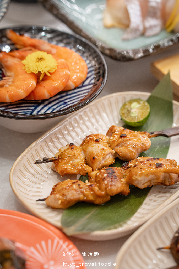 經過一番炙烤,鎖住肉汁的鹽烤雞肉串,僅用七味粉簡單調味,軟嫩口感裡,層次的微焦香外皮與七味粉和著肉汁的香氣,好吃的剛剛好。