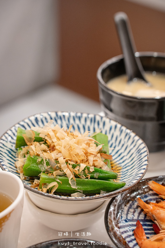 細軟黏滑的秋葵簡單川燙後,淋上日式醬油、灑上柴魚片呈現,適合做為開胃菜享用。