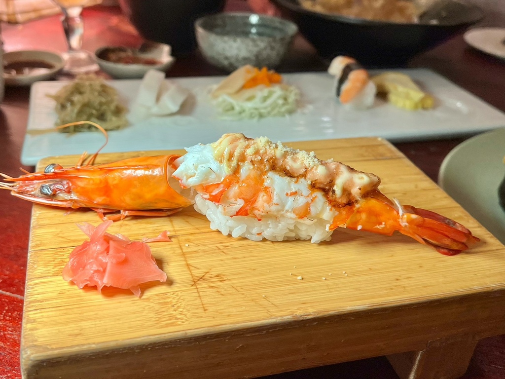 吃完這麼多還有點意猶未盡,我額外加點了五六日才有的限定握壽司,超大一貫炙燒明太子醬大蝦握壽司~