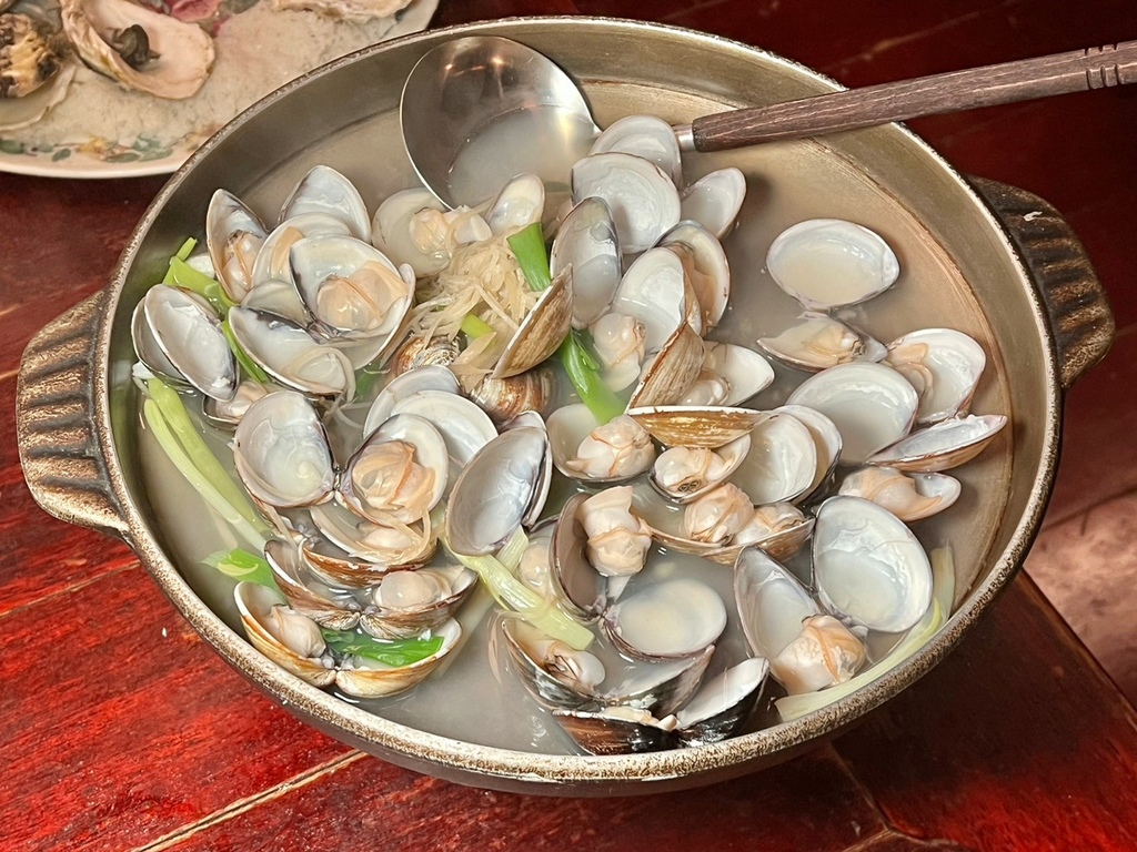 料多多土瓶湯裡頭用料超多,湯頭清澈超先鮮甜,加購價只要100~酒蒸蛤蜊超大一盤,滿滿的蜆精有夠補~ 澎湖烤生蠔🦪產地直送,非常鮮甜又多汁,一上桌還冒著火焰🔥