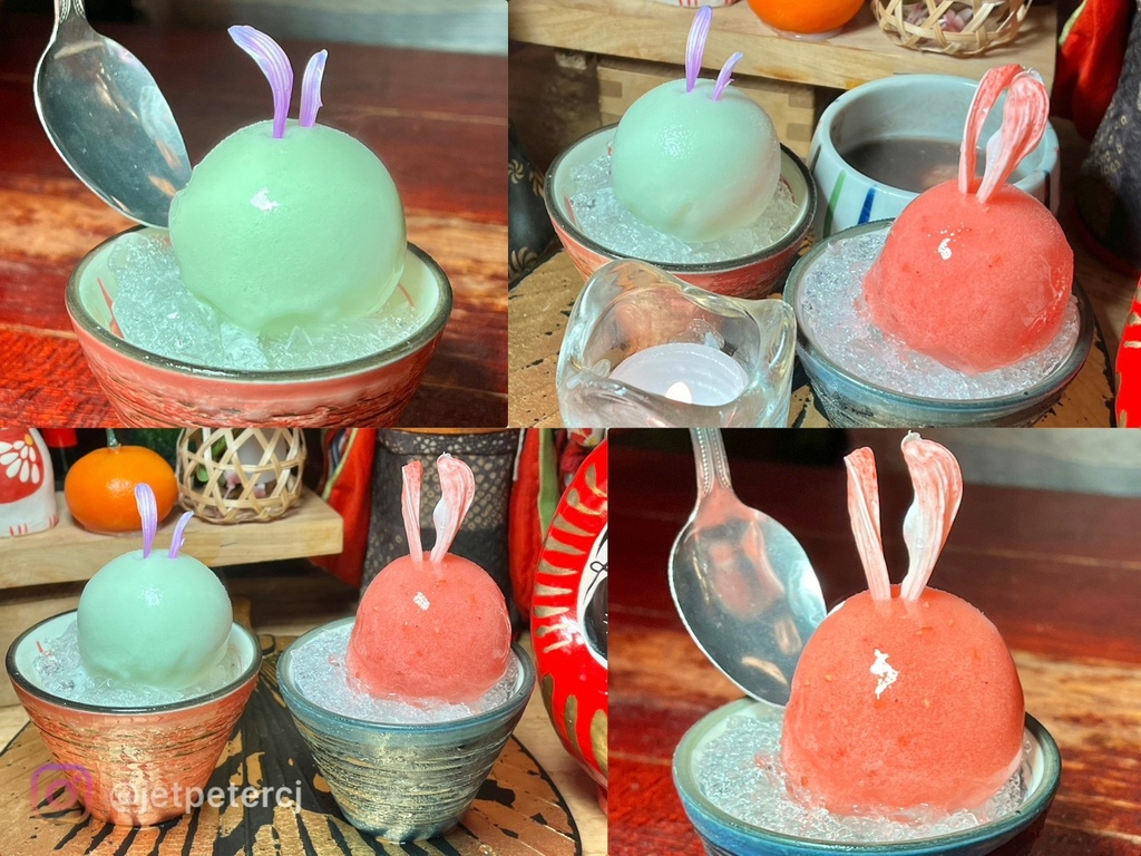 冰淇淋口感有點像雪酪,冰涼細緻的口感,麝香葡萄、覆盆子兩種口味都偏酸,相當清爽可以除去口中油膩感,上頭還有兔子耳朵的造型超級卡哇伊