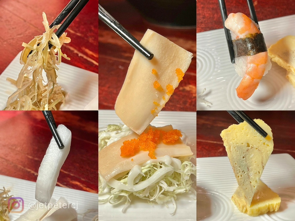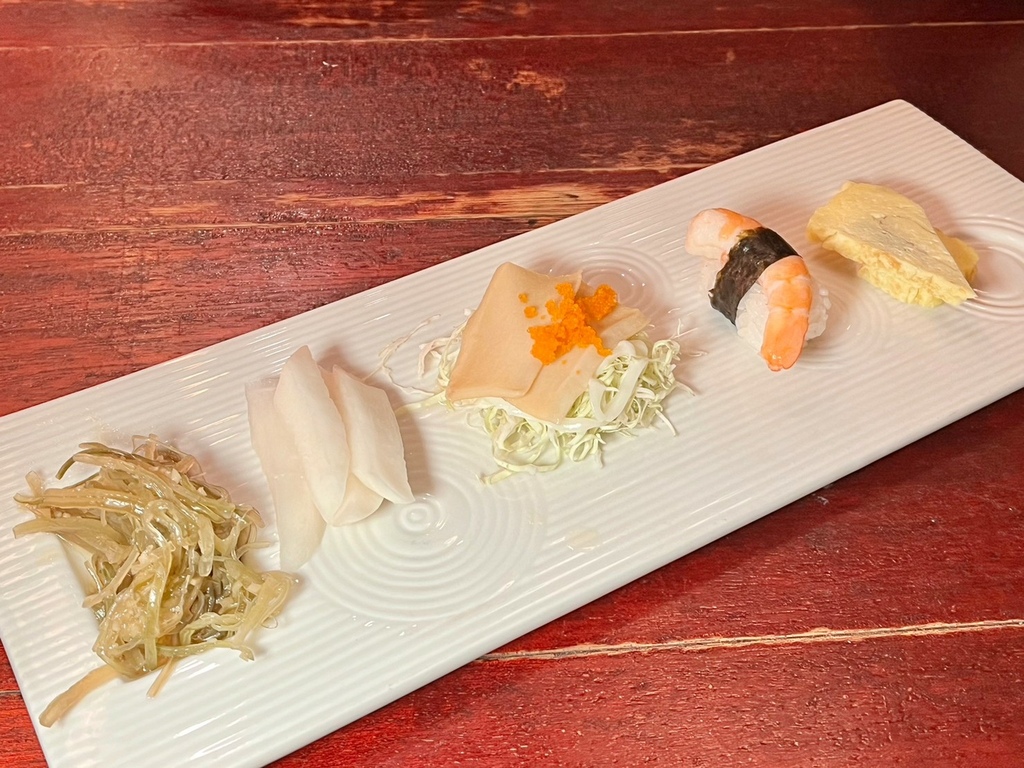 小林英夫招牌小菜一次就可以吃到五種,爽口的小菜海帶芽、醃蘿蔔,台式經典的代鮑魚片,還有軟綿的玉子燒等