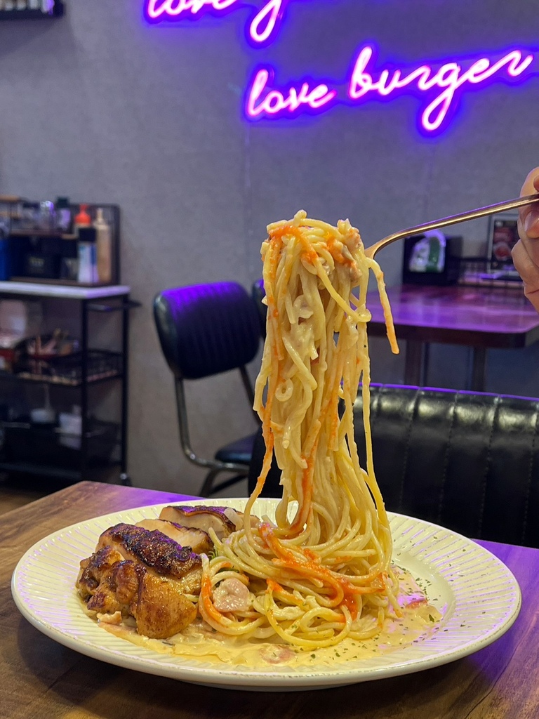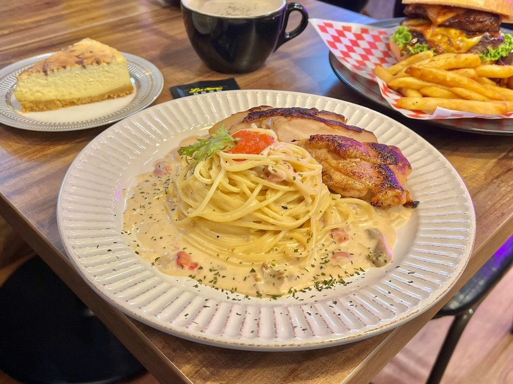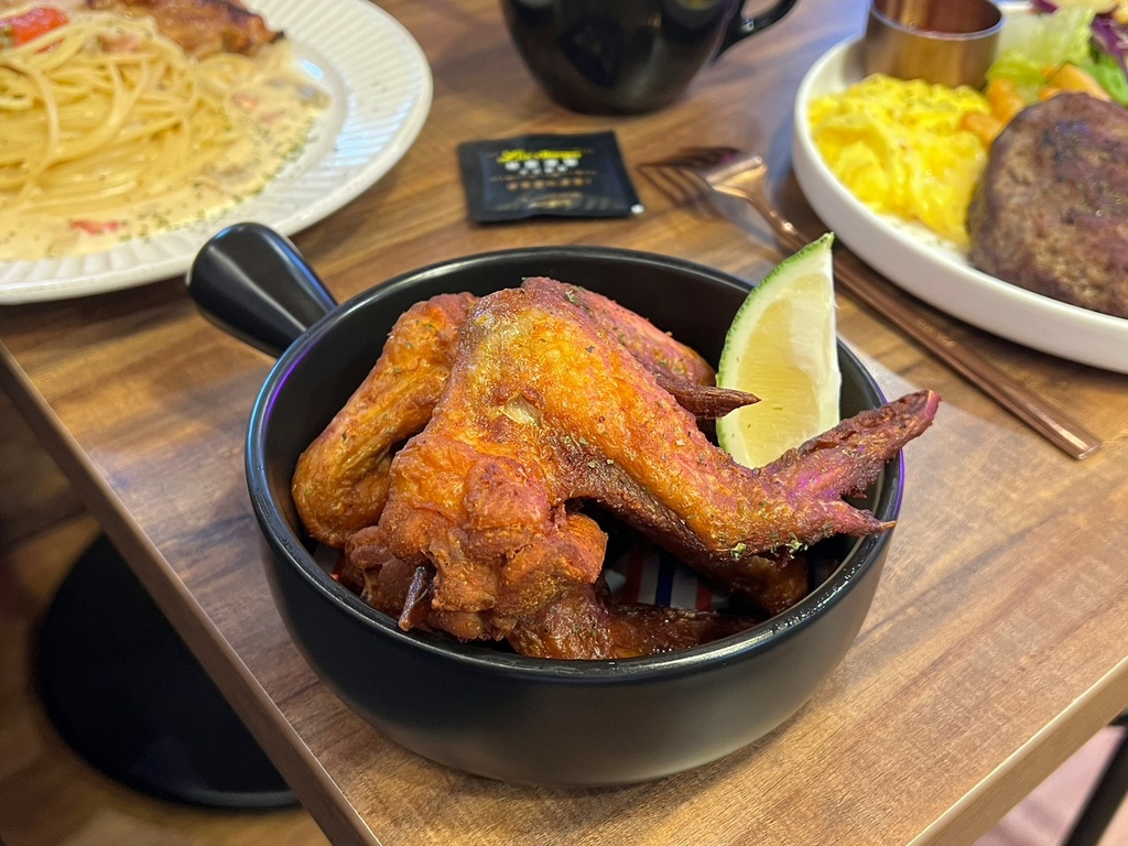 3. 明太子雞腿排義大利麵,麵條沾裹香濃白醬及明太子,麵條彈牙又涮嘴~炙燒雞腿排超入味我超推薦!紐奧良雞翅,肉質細緻飽滿,帶點微辣一吃就欲罷不能的道地美式滋味~