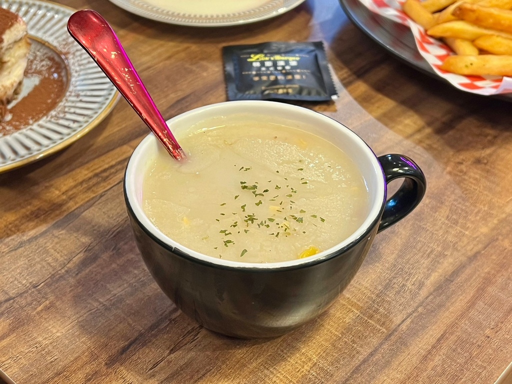 今日的主廚濃湯是熱騰騰的玉米濃湯,裡頭料好實在,甜甜的好滋味,大小朋友都會很喜歡,喝上一碗整個人好暖心喔,下次想試試法式巧達濃湯!