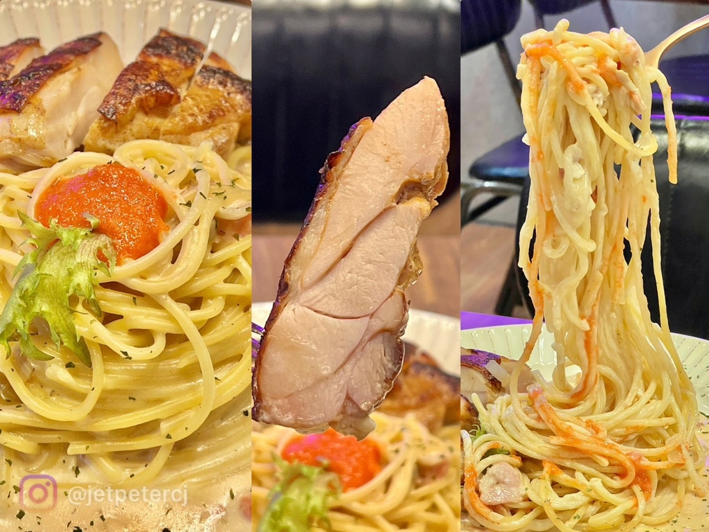 且雞腿鮮嫩多汁,彈性的口感,不會乾柴!麵條吸附明太子跟白醬的精華