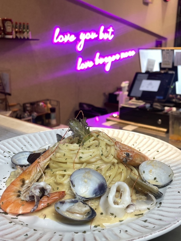 此外每季都有新的新菜色上市,讓人驚喜又期待,這是下季要推出的白醬海鮮義大利麵,看起來是不是很讚呢,迫不及待的想再來嚐嚐呢~