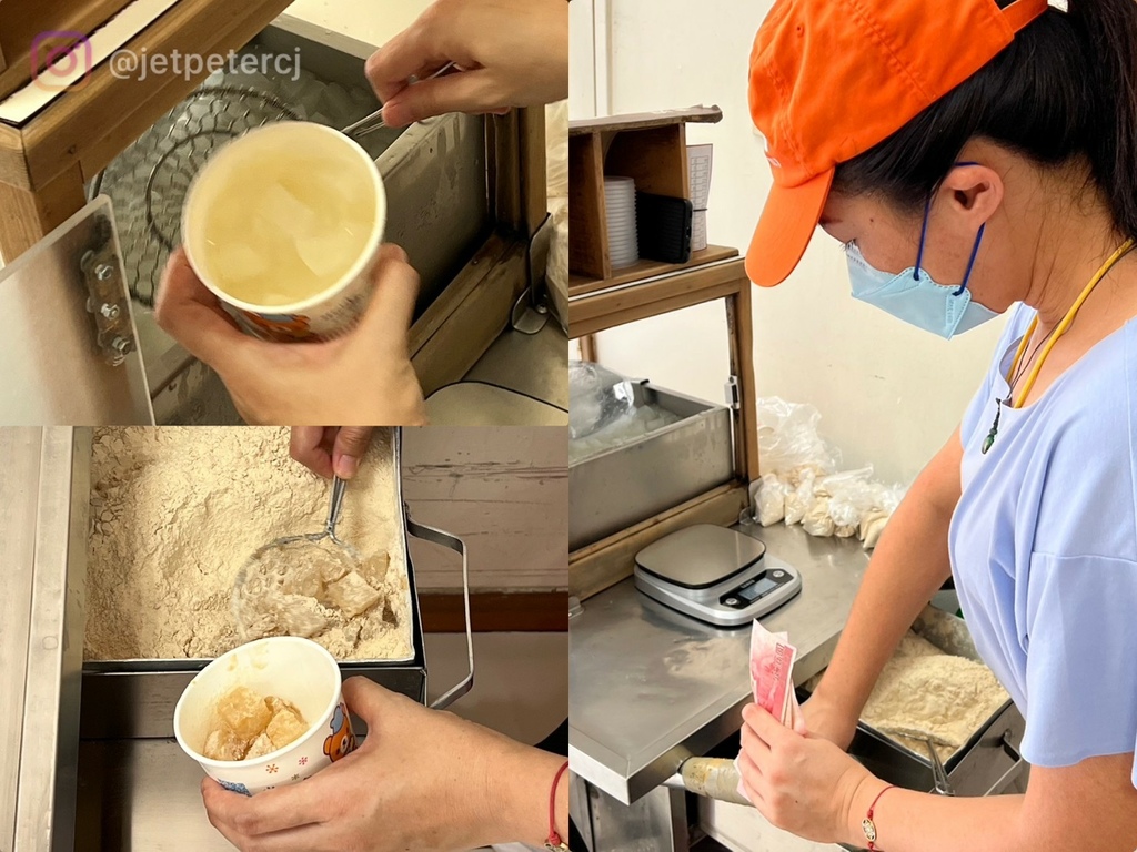 一塊塊晶瑩剔透的粉條,彈彈QQ的口感,看起來好誘人,外帶黃豆粉會另外包裝,想吃再自己加不用怕出水太濕