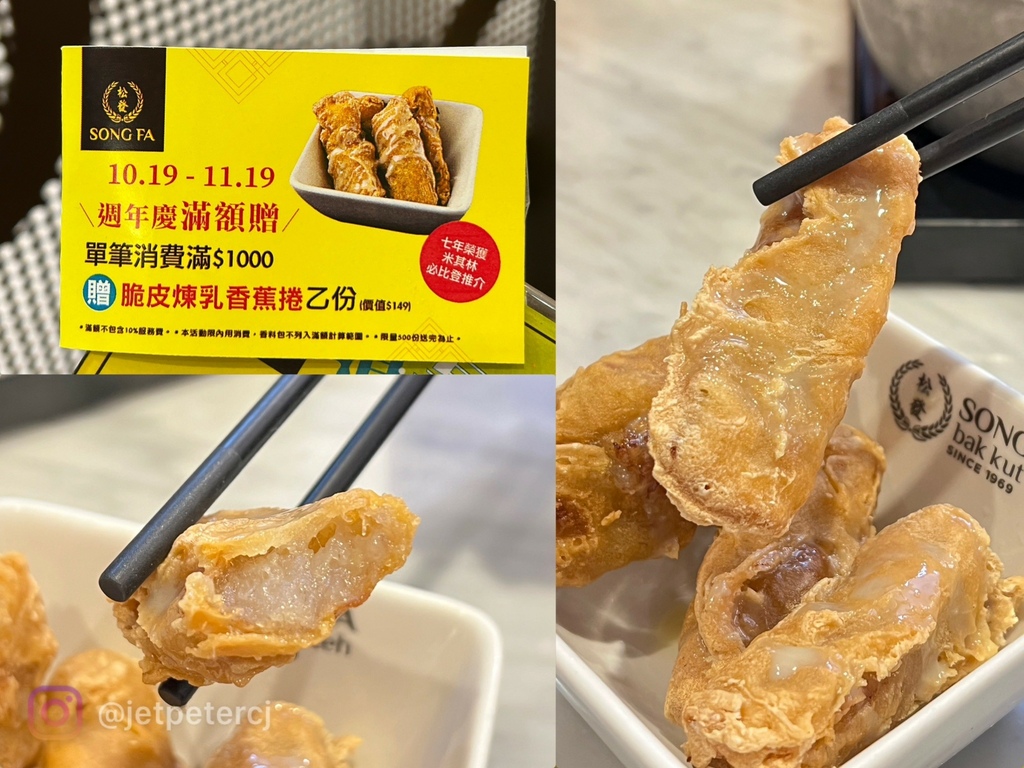 最後不忘再點份脆皮煉乳香蕉捲當甜點,搭配薏米水、香蘭葉冰茶、鐵觀音都好速配,一口飲品一口香蕉捲,劃下松發肉骨茶最棒的用餐句點~