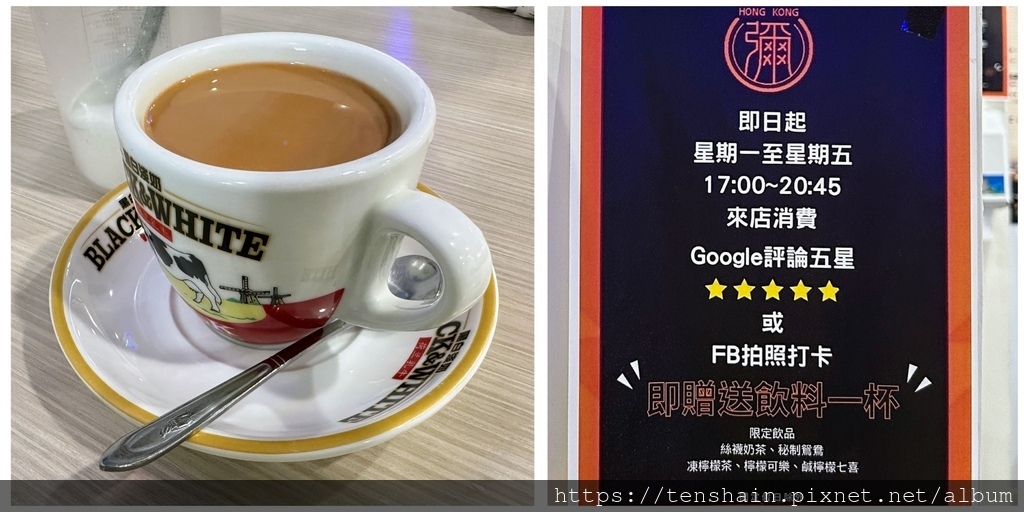 「彌敦道港式茶餐廳」的絲襪奶茶有凍有熱,凍奶茶上桌前已經有甜度,熱茶則否,因為熱茶甜度可以依個人的喜好自行加糖。額外告訴大家一個好消息,週一~週五來店消費,並在 GOOGLE 評論五星,或在 FB 上拍照打卡,就可以獲贈飲料一杯,這樣的好康,千萬不要錯過!