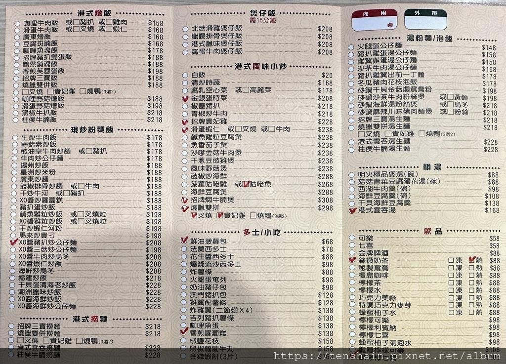 菜單的品項有"港式燴飯、現炒粉麵飯、港式撈麵、煲仔飯、港式風味小炒、多士、小吃、湯粉麵、泡飯、靚湯、飲品...",蛋得讓我們眼花撩亂,選擇困難症立刻發作。還好服務生非常貼心,不但仔細為我們介紹菜色,還會適時提供中肯的推薦,給予我們很大的幫助。在他推薦的品項中,印象特別深刻的是煲仔飯,因為要現點現做,所以需要等候 15 分鐘,上桌後高溫的砂鍋會持續提供熱量,讓底部的飯形成微微脆口的鍋巴,又香又好吃。聽他說得繪聲繪影,說實在我蠻動心的,可惜考量到我和老婆的胃量不大,第一次造訪又想多吃幾道菜,只好辜負他的好意,改天有機會再來品嚐。