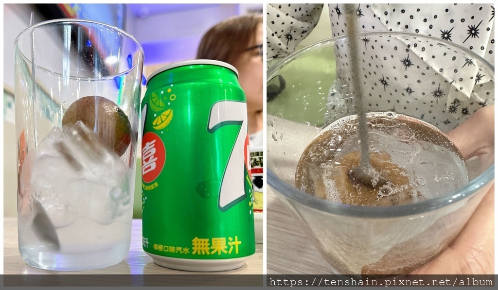 "鹹檸檬七喜"也是非常具有香港特色的飲料,杯子裡的醃漬檸檬是重點,不同於一般醃漬水果的慣性,這顆醃漬檸檬是鹹的而不是甜的。倒入七喜汽水之後,用長柄匙邊戳邊攪拌,喝起來又酸、又鹹、又嗆,非常爽快!