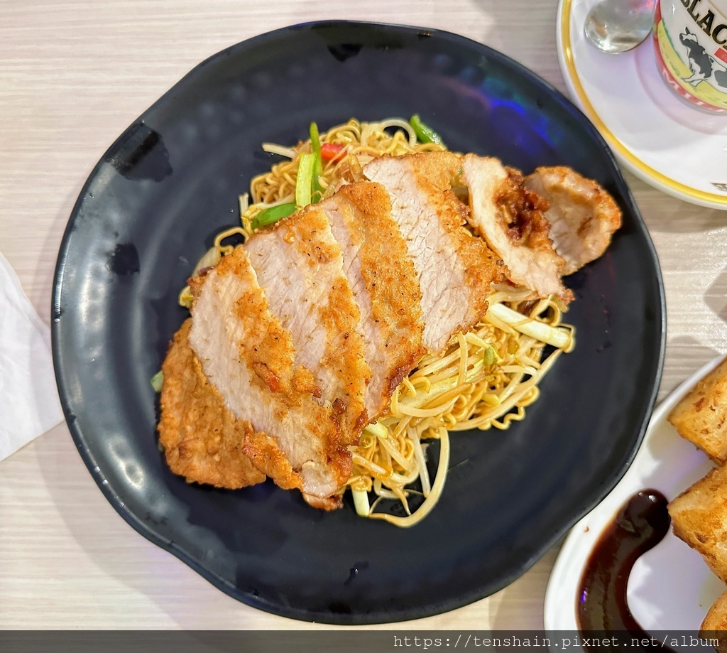 現點現炒的公仔麵鑊氣滿滿,每一條細麵上都裹滿 XO 醬,微脆的口感,鹹香又開胃。斜切片薄的豬扒,嚐起來香嫩不膩,滋味可口。