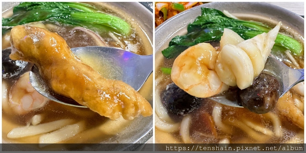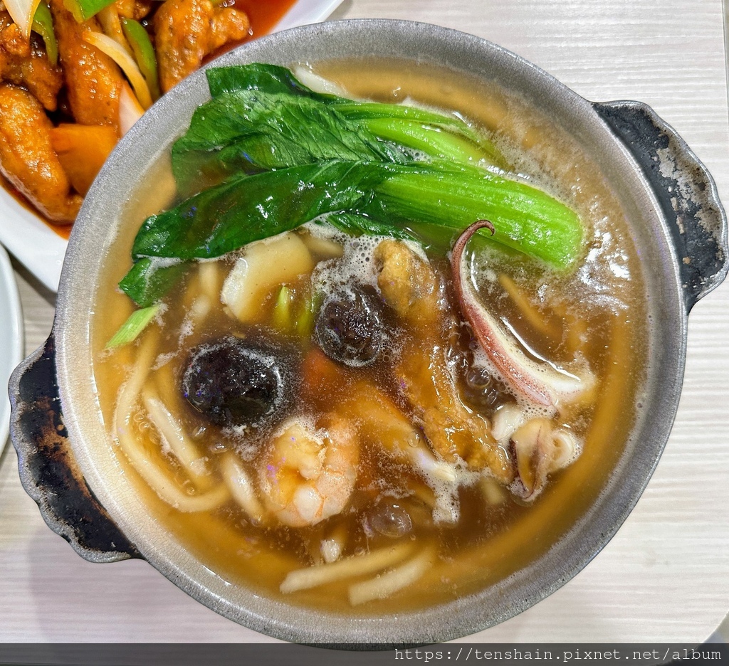 香港人口中的「烏冬」,其實就是我們說的「烏龍麵」。這道"砂鍋海鮮湯烏冬煲"使用讚崎烏龍麵,口感軟 Q 卻不軟爛,還有大量的海鮮鮮蔬,包括干貝、草蝦、鱸魚、花枝,還有青菜和香菇,料多味美。湯汁也不容小覷,因為煲湯本來就是香港人的強項,喝起來甘美滑順,滋味無窮!