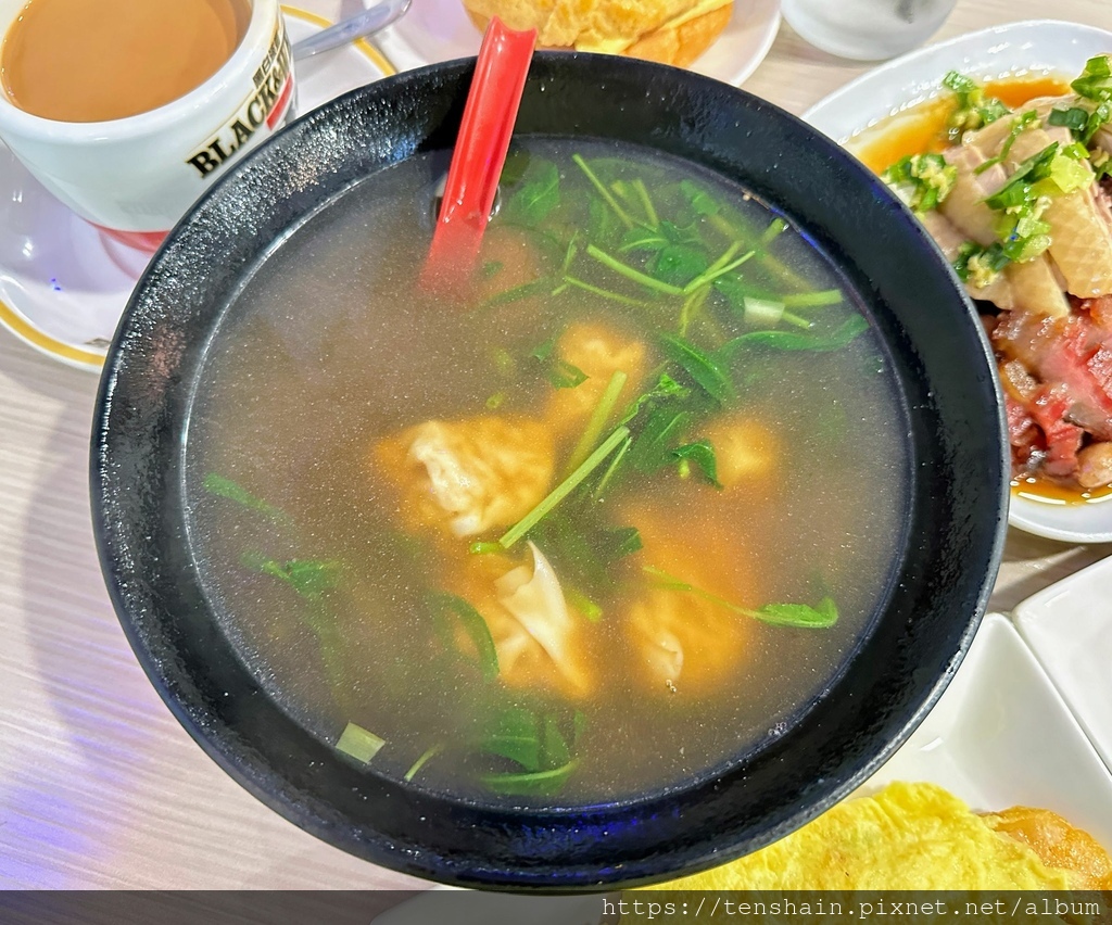 顆顆飽滿的雲吞,每一顆都包著紮實的肉餡和一整隻緊實 Q 彈的草蝦仁,比一般店家的雲吞大上兩倍以上,吃起來超過癮。雲吞湯也芳香甘甜,有令人一口接一口喝個不停的魔力。