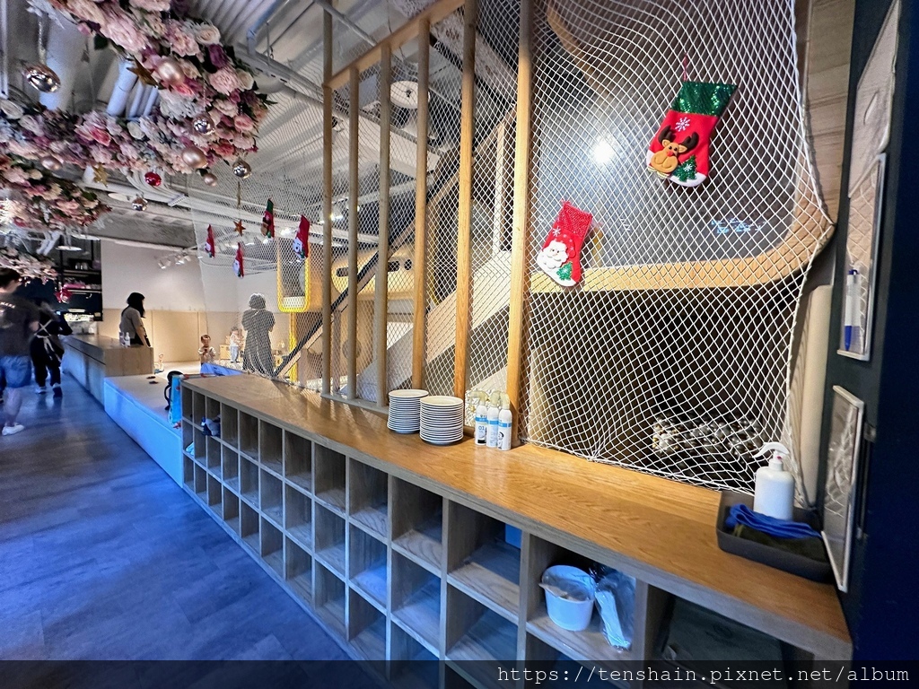 遊戲區的外面是置鞋櫃和置物櫃,置物櫃台上擺放著消毒液,免費供父母取用。這裡的用餐分成三個時段:11:00-13:30、14:00-17:00、17:30-20:00,中間間隔的 30 分鐘,可不是員工的休息時間,而是清潔和消毒的時間,加上開店前的一次,每天共三次清潔和消毒,衛生維護之周全,無可挑剔。