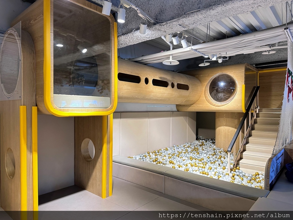 如果家長還是不太放心,或是想要親自陪玩,還是想用相機捕捉寶貝的一舉一動,記錄珍貴的成長軌跡,也可以一起進入遊戲區。遊戲區有貴氣的金銀球池,還有圓筒隧道可爬行到小小秘密基地,更有琳瑯滿目的各種玩具,讓孩子盡情放電。