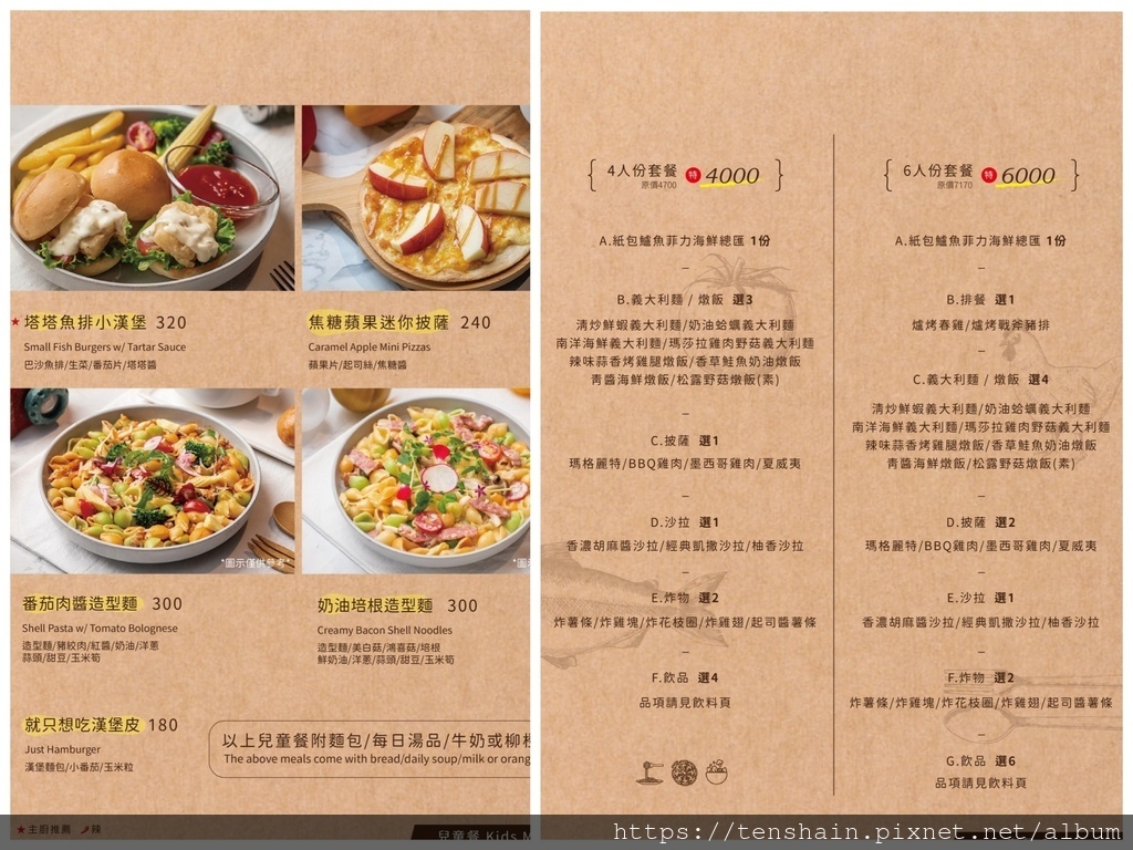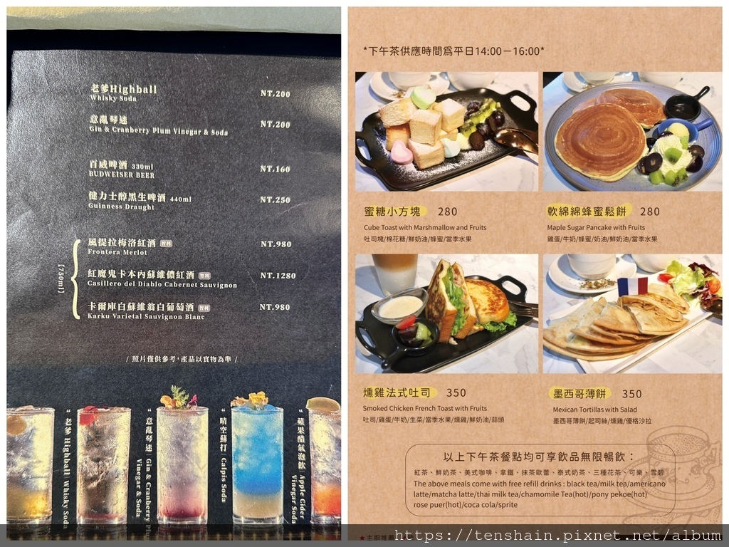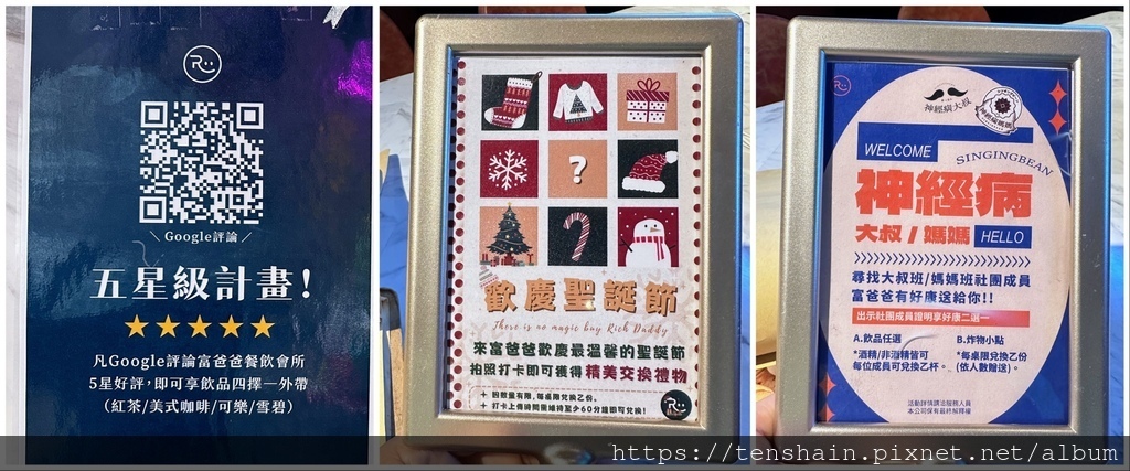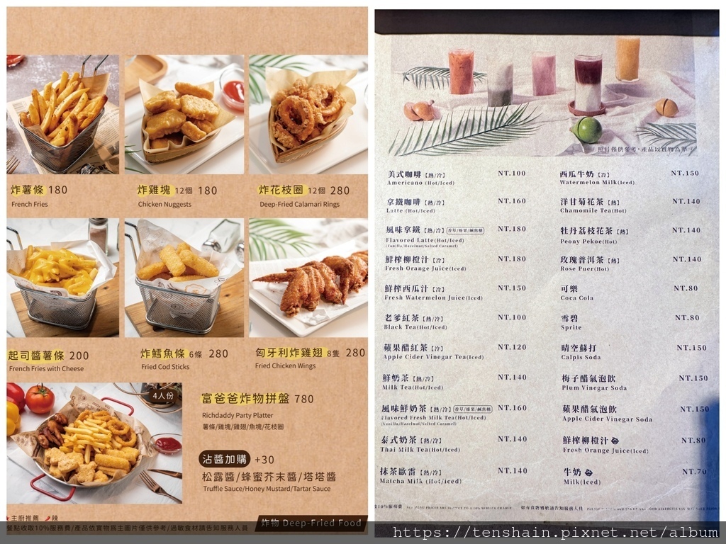 「富爸爸餐飲會所」的菜單很齊全 ( 文末附有目前的完整菜單,若有變動請以現場為準 ) ,有"排餐、燉飯、義大利麵、漢堡、炸物、飲料",當然也有兒童餐。"排餐、燉飯、義大利麵、漢堡"均可加價升級為套餐,套餐飲料也可以加價改選你喜歡的飲品。平日 14:00 - 16:00 還供應四款下午茶餐點,價位分別是280 元、350 元,而且還提供"紅茶、鮮奶茶、美式咖啡、拿鐵、抹茶歐蕾、泰式奶茶、三種花茶、可樂、雪碧"無限暢飲,超級划算!要知道,正餐時點一杯拿鐵咖啡就要 160 元,抹茶歐蕾 140元,等到喝兩杯就回本,這樣的好康簡直像天上掉下來的聖誕禮物,怎麼能錯過?
