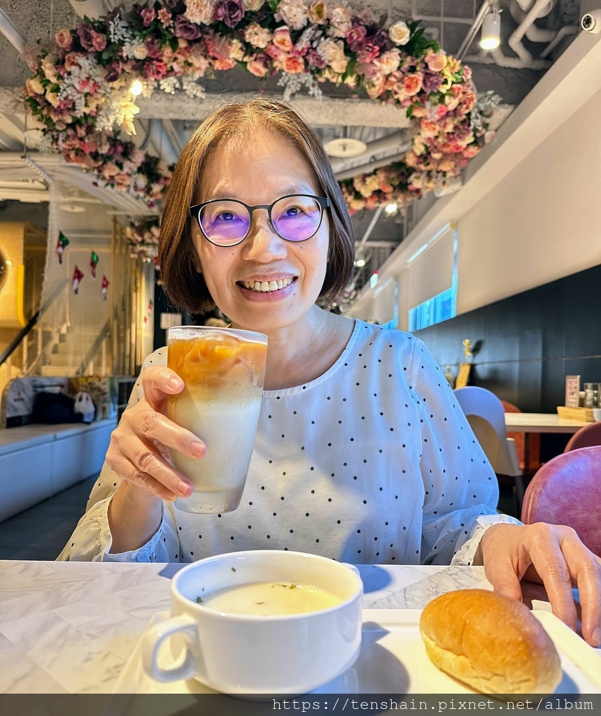 "榛果風味拿鐵",$160 元,好拍又好喝,濃醇奶香、榛果香氣和咖啡風味交織,每一口都回味無窮。每日湯品是玉米濃湯,湯汁濃郁順口,但玉米粒不多;奶油麵包烤得很鬆軟,口感不錯。