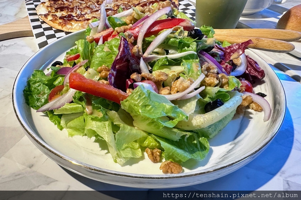 香濃胡麻醬沙拉 250 元,內容相當豐富,有"生菜、核桃、甜椒、小番茄、黑橄欖、紫洋蔥、櫻桃蘿蔔",健康滿滿。