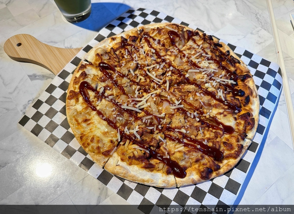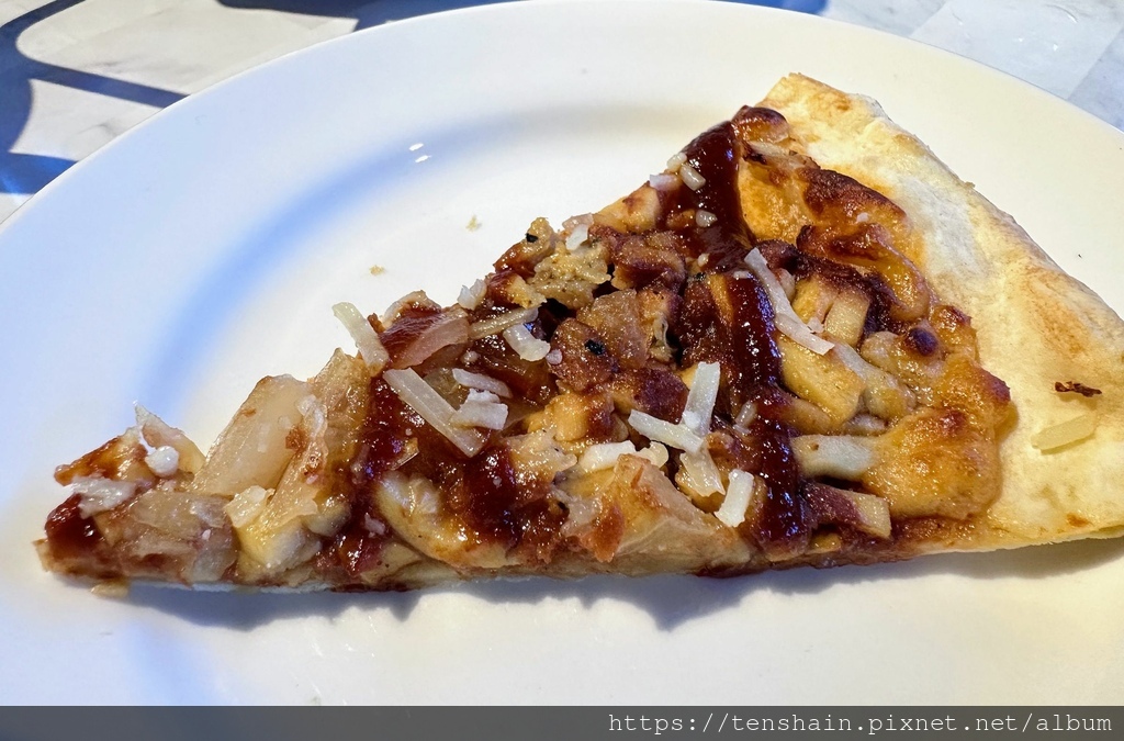 比起厚餅皮,我更愛薄餅皮,因為攝取太多的澱粉不但不利健康,而且容易飽,就吃不下其他的美食了。我也不喜歡一大堆的起司,尤其是那種拿起來就會牽絲的起司瀑布,根本就是熱量炸彈,讓人望而生畏。這款 BBQ 雞肉披薩,有薄脆的外皮,在 BBQ 醬的加持下,雞肉的滋味非常濃郁。洋蔥和起司只是起到助攻的角色,讓香氣多一點,口感多一點,卻不會喧賓奪主,非常對我的胃。