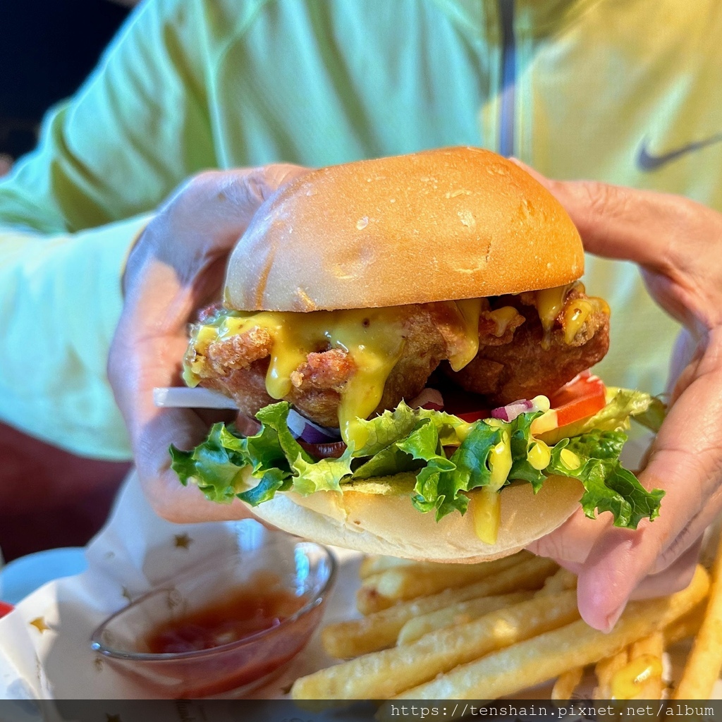 齜牙咧嘴大口咬下,這不是紳士富爸爸、優雅富媽媽的風格,那就拿餐刀切開來吃吧!雞腿排的厚度驚人,雞皮酥脆,肉質軟嫩多汁。蜂蜜芥末醬有點甜又不會太甜,黃芥末有香氣、沒有嗆味,讓雞腿肉吃起來更滑嫩。切成小塊的雞腿肉再夾回漢堡,一口咬下,有肉、有菜、有麵包,飽口又過癮。