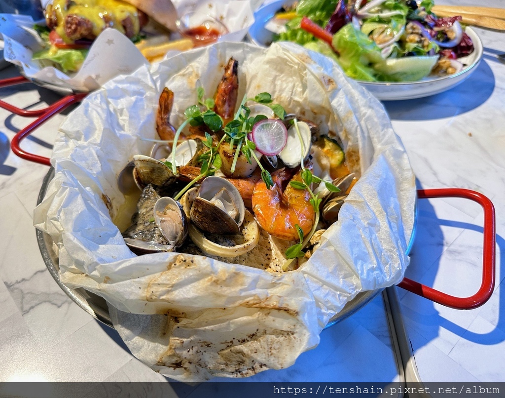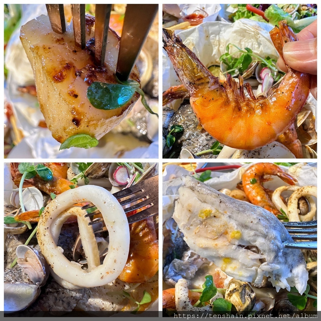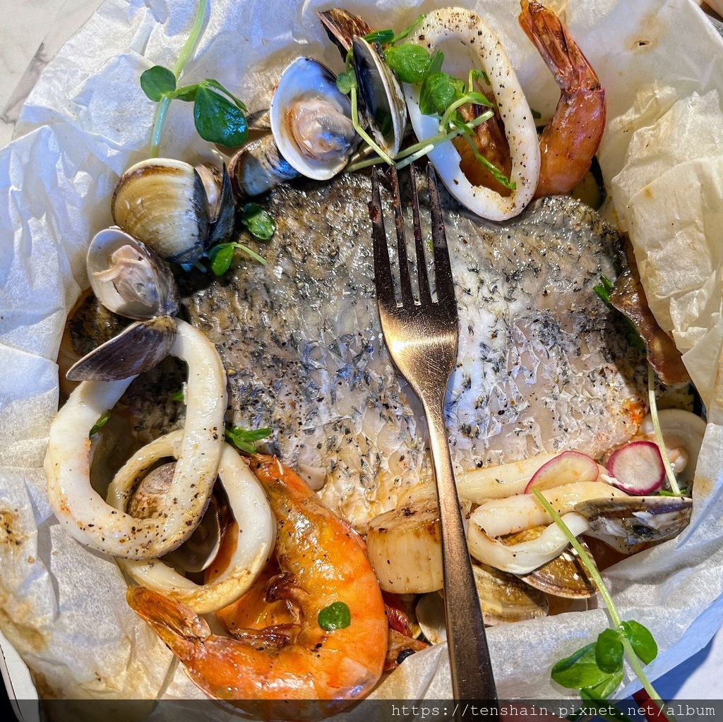 將"鱸魚菲力、干貝、鮮蝦、蛤蠣、魷魚、金針菇、小番茄、櫛瓜"用烘焙紙包住,灑點白酒、檸檬汁,再加上奶油,放入烤箱烘烤 20 分鐘。紙包烘焙的烹飪方式,完美地將海鮮的甜度和香氣鎖住,一端上桌就香氣四溢,引人垂涎。