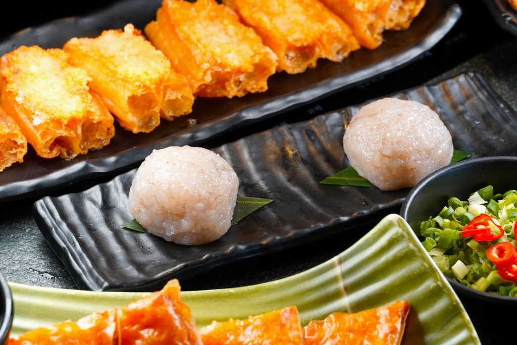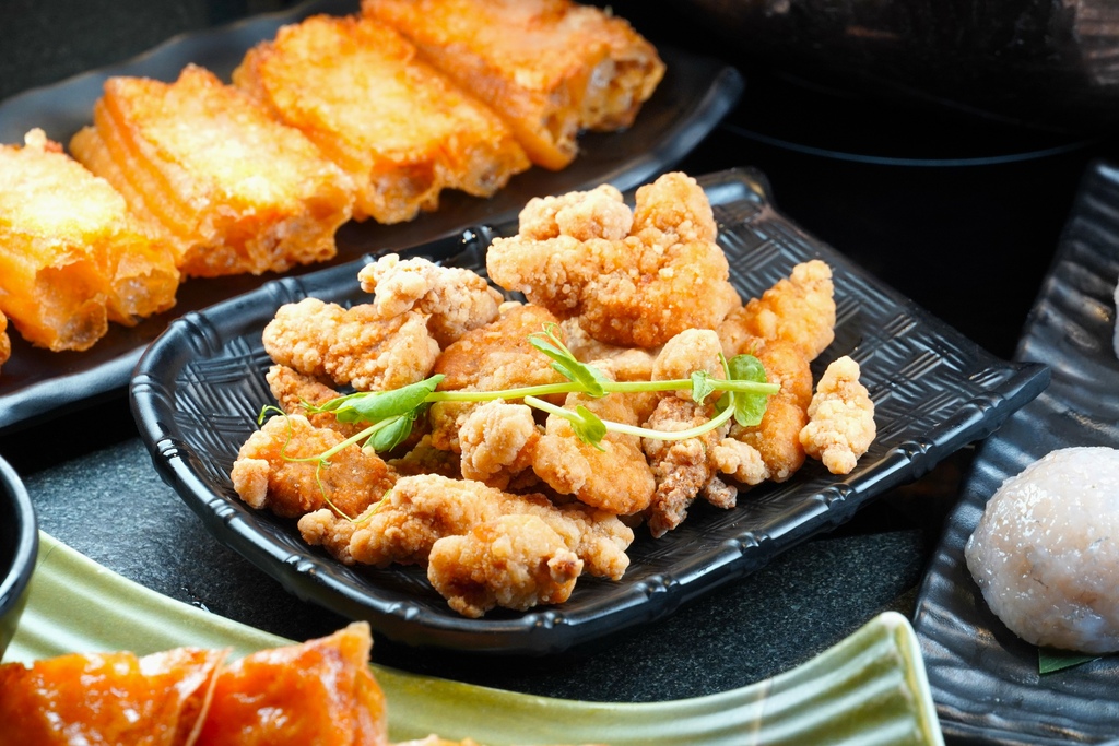 在等待鍋中食材烹煮的同時,撈王鍋物料理有超多美味熟食可以選擇,像是這炸到外皮酥脆裡頭的蝦漿Q彈的蝦餅沾上酸酸甜甜的沾醬,真的一片接著一片完全停不下手中的筷子。