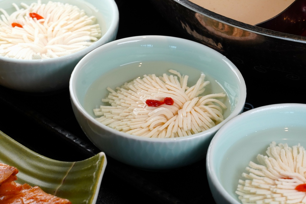 這繡球豆腐小金在台灣的餐廳已經幾乎是看不到了,沒想到來撈王鍋物料理還能吃到,這可是考驗師傅刀功的功夫菜,才能呈現這一朵朵的豆腐繡球花。