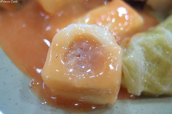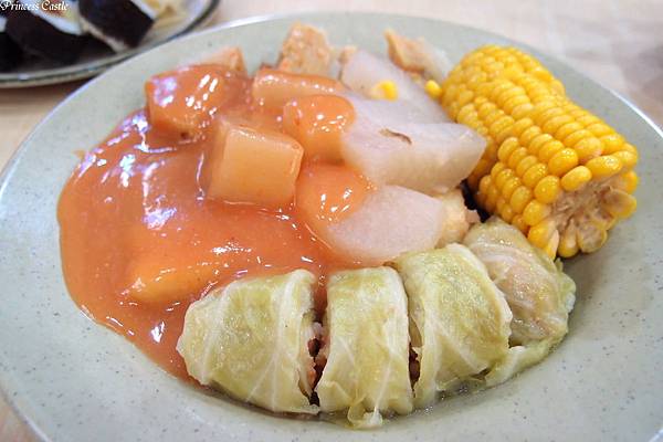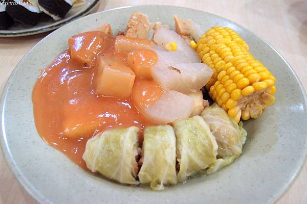 關東煮點了白蘿蔔、玉米、高麗菜捲、苦瓜丸