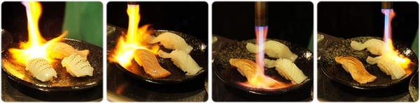 坐在吧台的好處,就是可以清楚的看老闆拿火槍炙燒生魚片
