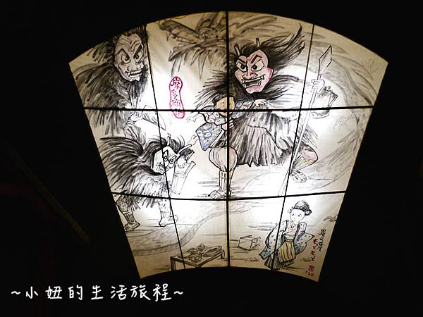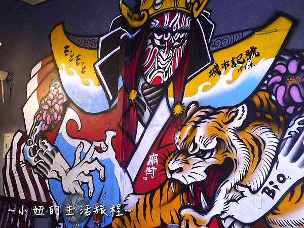 牆壁上是請不用打草稿的畫家,直接6小時後噴漆完成的圖畫,這位是穿著日本武士盔甲的八家將,這幅畫很有氣勢、但卻不嚇人